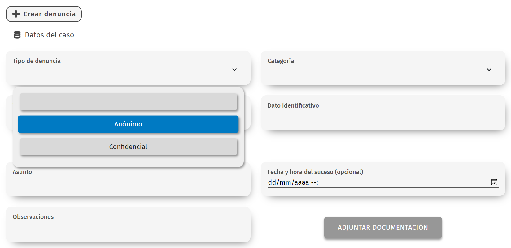 L’usuari denunciant podrà generar la seva denúncia de manera personalitzada en especificar el tipus (confidencial o anònima), la categoria corresponent, seleccionar la seu adequada (si hi ha múltiples seus), indicar la data i hora del succés, proporcionar un resum detallat i adjuntar documentació rellevant per aportar més informació sobre la denúncia.