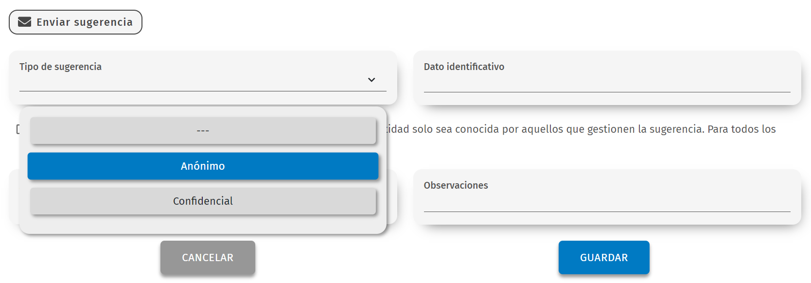 Ofereix als usuaris l’oportunitat d’enviar suggeriments. Les mateixes, que seran visibles a l’àrea responsable, es gestionen de manera separada de les denúncies i no comporten un seguiment.